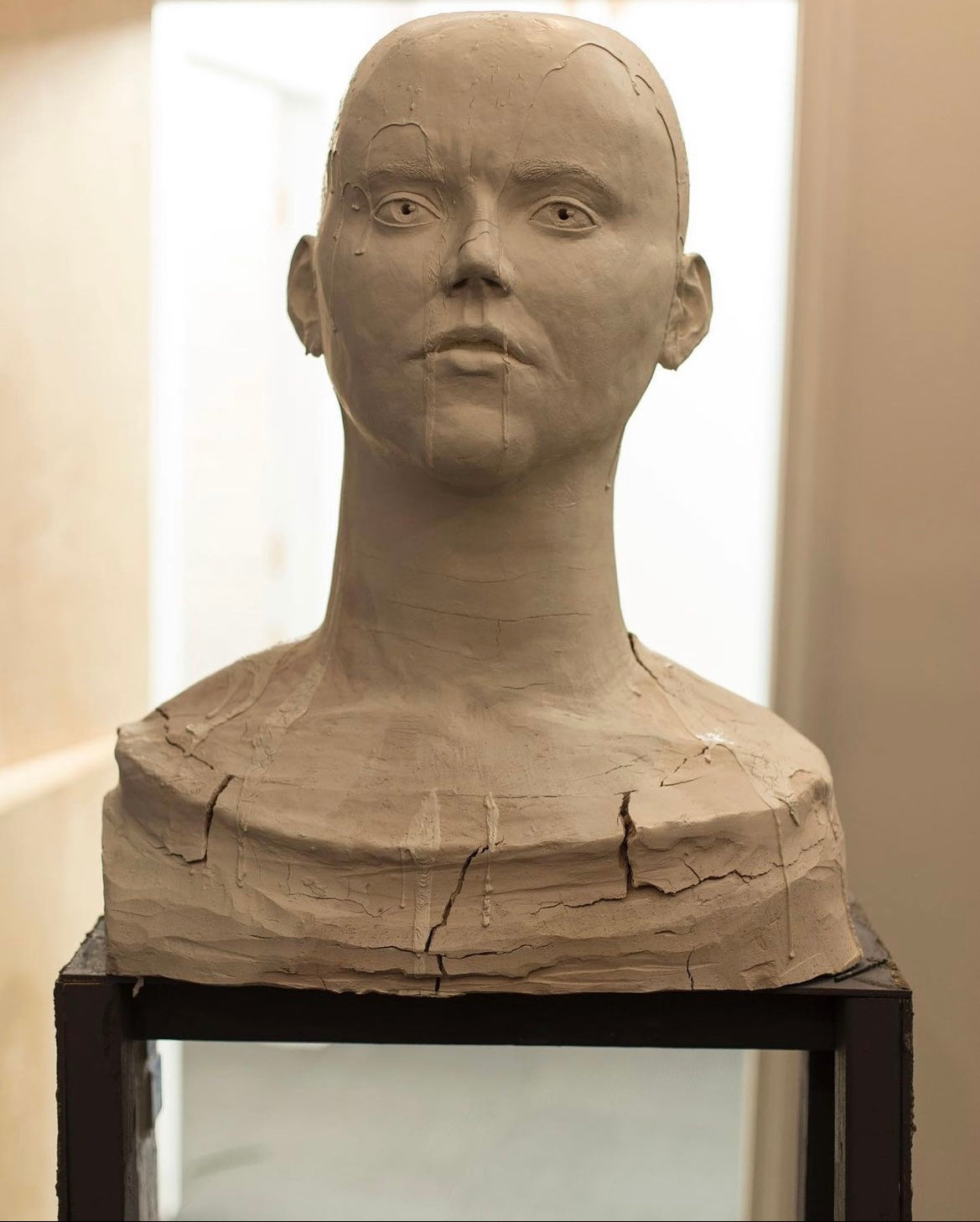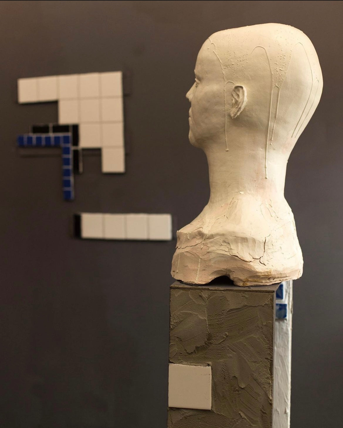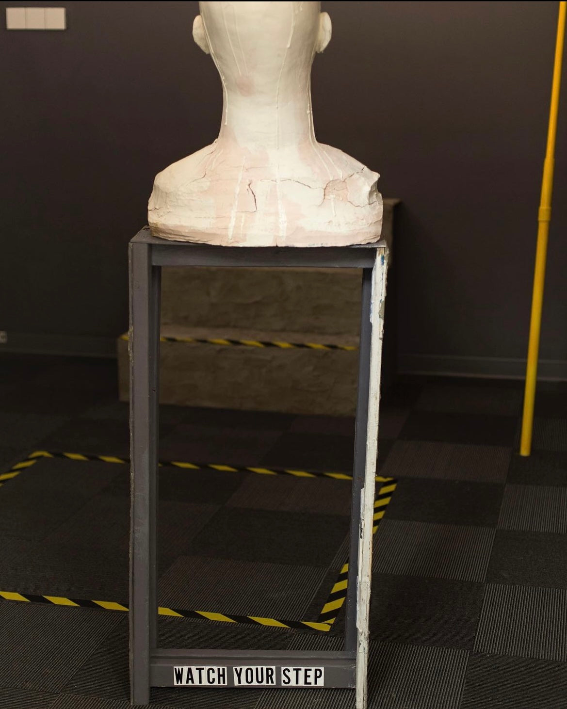 I’ve recreated pieces of the subway and adding texts as a warning. The floor is taped in a maze controlling the viewers movement through the space. The deconstructed designs of the tiles are paired with a an imprint of a syringe in concrete on the walls. The bust stands 6’ tall and is slightly looking up allowing the viewers intercept the gaze.