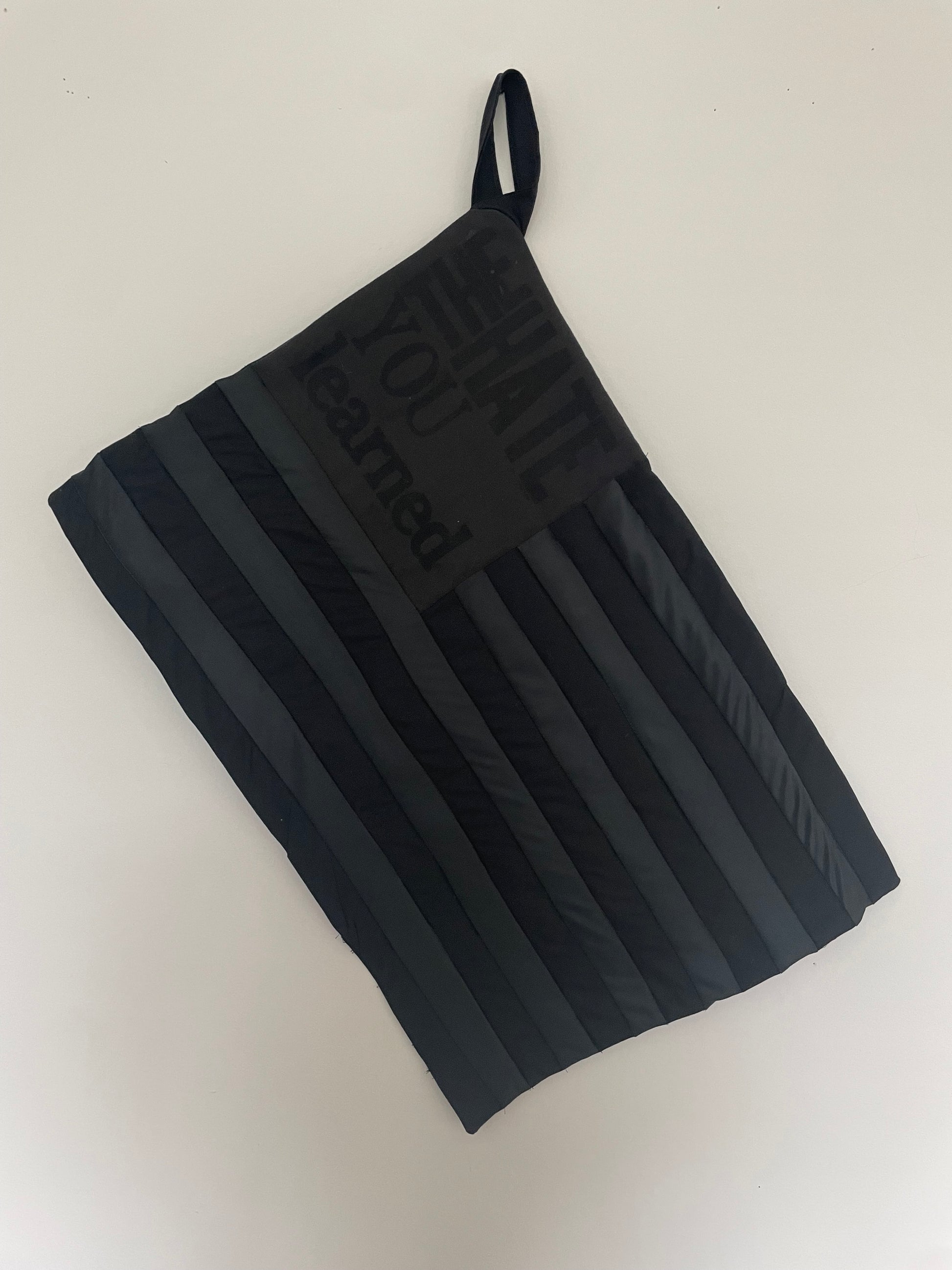 Love for home, family, or tradition is complicated by the moral reckoning with what those things have represented. In my quilt work, this manifests as a negotiation of space, pattern, and distortion. The grid offers structure, but what is underlying bleeds through telling a messier story. I’m looking to continue my exploration of culture but widen the lens to explore how pride is represented through cultural symbols like flags in America. The No-Quarter Flag is part of the Confederate flag family that stands for no lives will be spared despite surrendering. Using a printing press, I printed "the hate you learned," replacing the space of the stars.